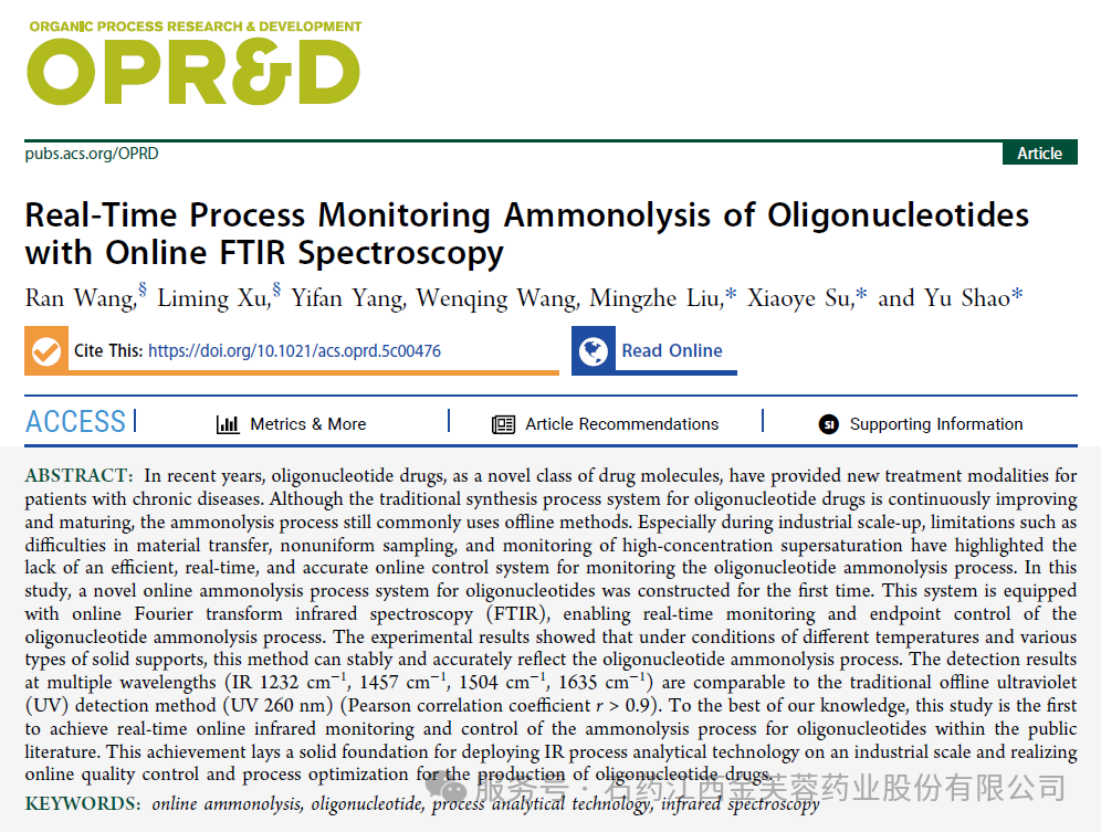 近日,由石药集团研发的基于红外光谱技术用于寡核苷酸在线氨解监测的研究成果以研究论文(Article)形式发表在国际著名化学期刊ACS旗下Org. Process Res. Dev.杂志,标题为《Real-Time Process Monitoring Ammonolysis of Oligonucleotides with Online FTIR Spectroscopy》。