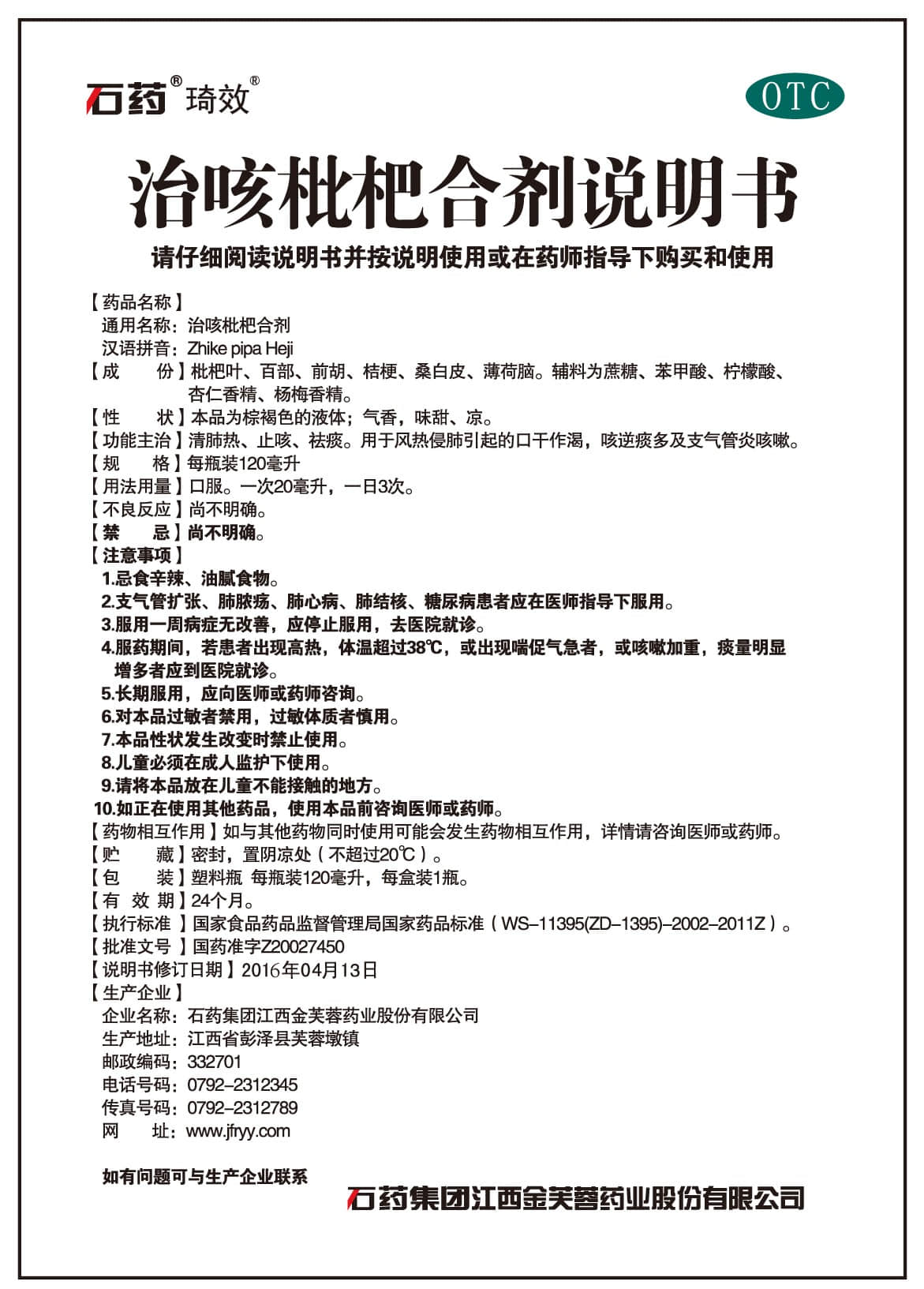 简要描述:【功能主治]清肺热、止咳、祛痰。用于风热侵肺引起的口干作渴,咳逆痰多及支气管炎咳嗽。[规格]每瓶装120毫升[用法用量]口服。一次20毫升,一日3次。【不良反应